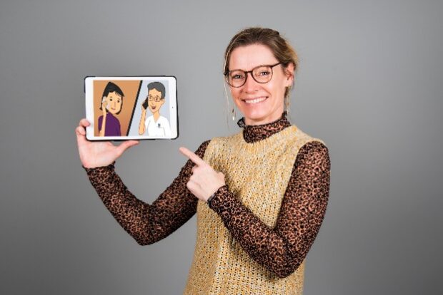 Janni Strøm, viser en af animationsfilmene frem. Foto: Agata Lenczewska-Madsen, Hospitalsenhed Midt.