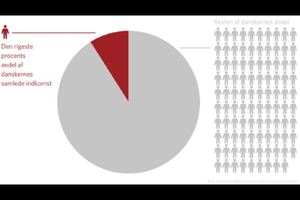 Den ene procent af danskerne, der tjener allermest, sidder på en større og større andel af danskernes samlede indkomster. Hver gang danskerne samlet set tjener 100 kroner, går 9 kroner til den rigeste procent.